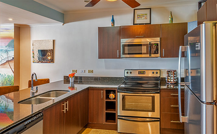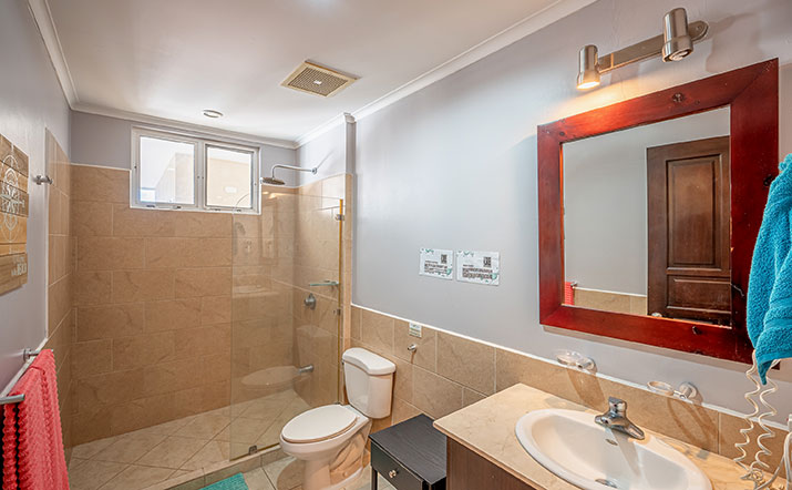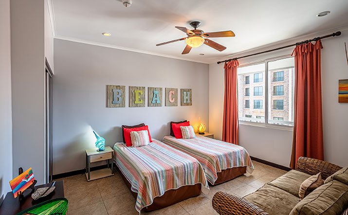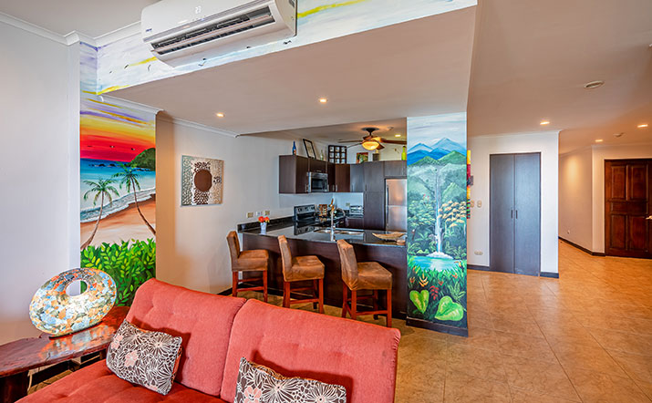 This 2-bedroom, 2-bathroom unit is located on the fourth floor and features a large oceanfront balcony with outdoor table and seating. The furnishings and fixtures are modern and luxurious. The Palms Jacó is ideal for families and groups that want to enjoy being right on the beach with great ocean views. A short walk or taxi ride from downtown Jacó, the north end of the beach is more pristine than the rest of Jacó Beach. A short walk to the north is Monkey Beach, which feels like a remote and private cove, and is a favorite of local fishermen.